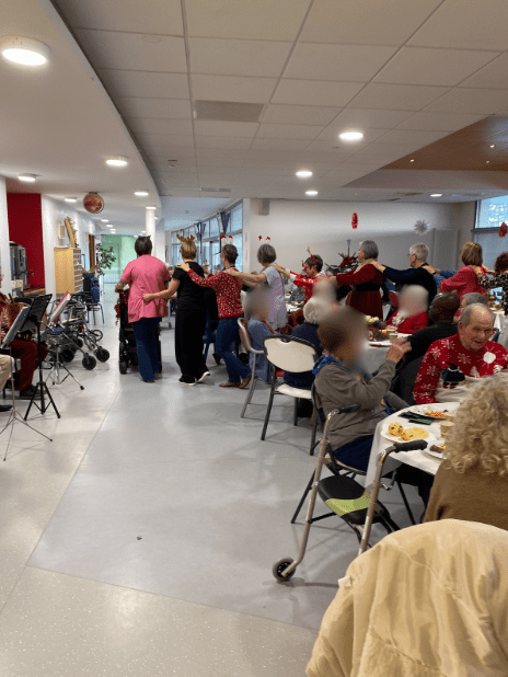 Ce n’était pas seulement un moment d’exaltation pour nos papilles gustatives, mais aussi un grand moment de tendresse et de partage. En effet, les résidents ont pu retrouver leur famille, des sourires étaient présents sur tous les visages, non seulement ceux des résidents mais aussi ceux des soignants, des cadres et des animateurs. Un moment de décompression pour tous, apporté par la magie des fêtes de Noël et par la douce mélodie des accordéonistes et guitaristes, qui nous ont fait chanter et danser durant une bonne partie de ce goûter de Noël.