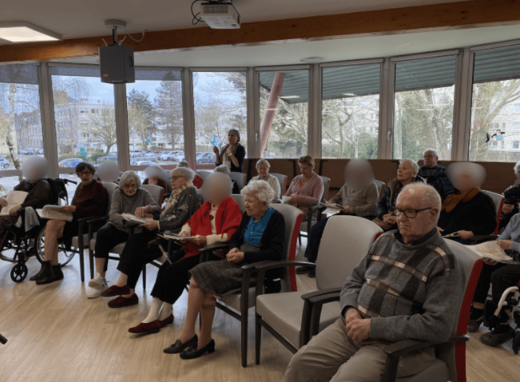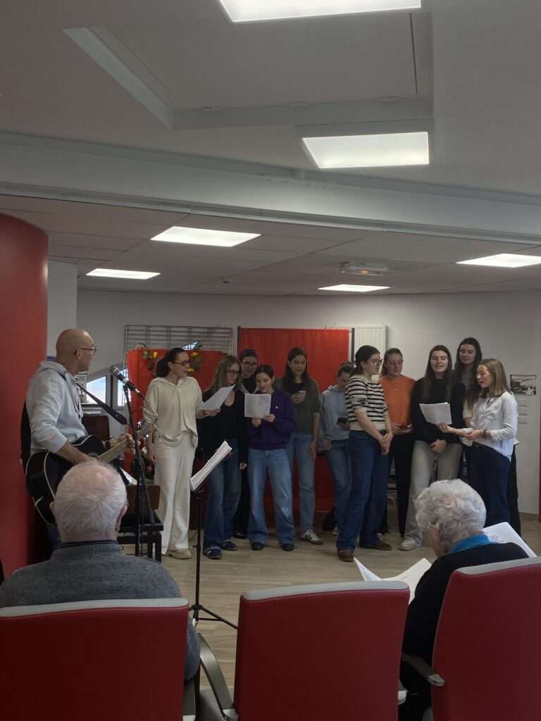Une fois les résidents bien installés dans leurs fauteuils, accompagnés de Régis à la guitare, les voix des lycéennes se sont élevées. Nos résidents se sont vus équipés de carnets de chants afin de suivre les élèves et partager pleinement ce moment avec eux. Les aîné(e)s ont ainsi pu chanter des chansons appréciées de tous, telles que « Santiano », « La Bohème » et encore « La Maladie d’Amour.
