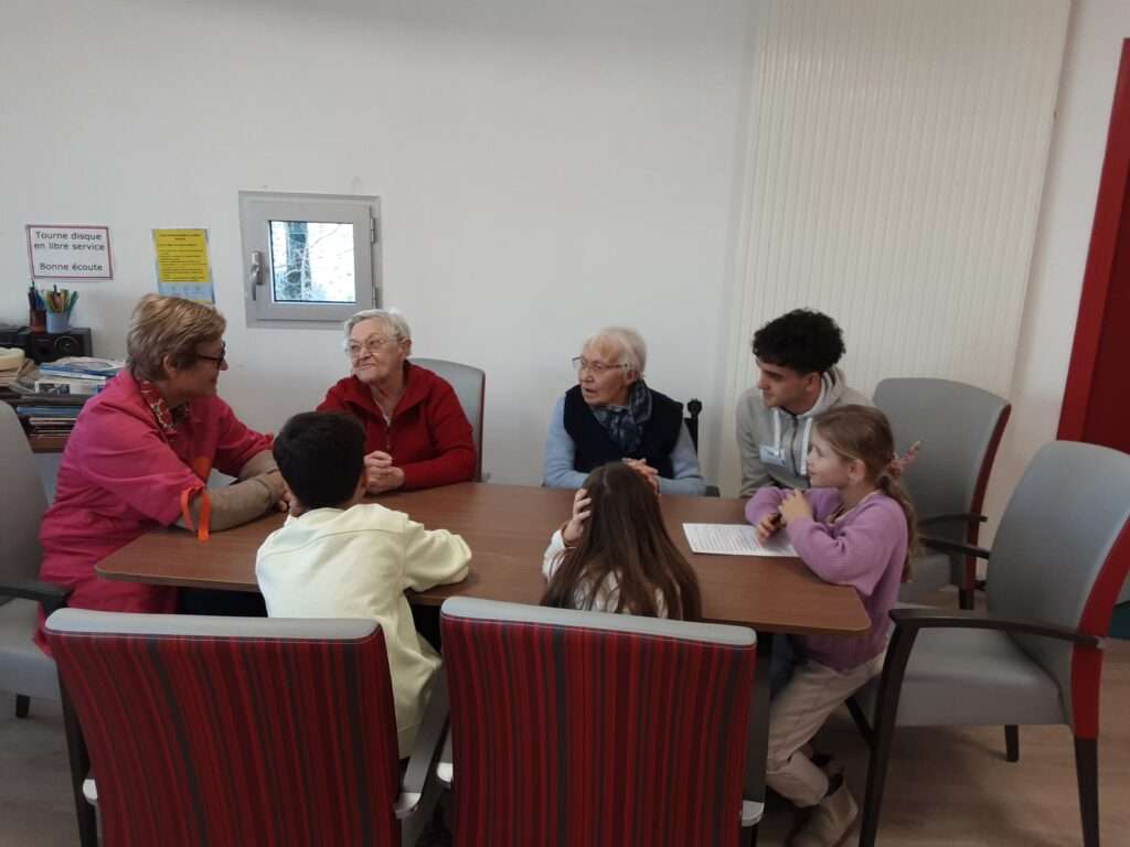Rencontre intergénérationnelle aux Oréades: les résidents partagent un moment unique avec les CE2 de sainte Jeanne d’Arc.